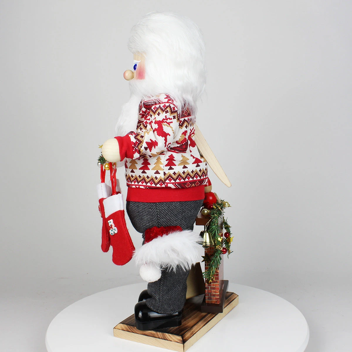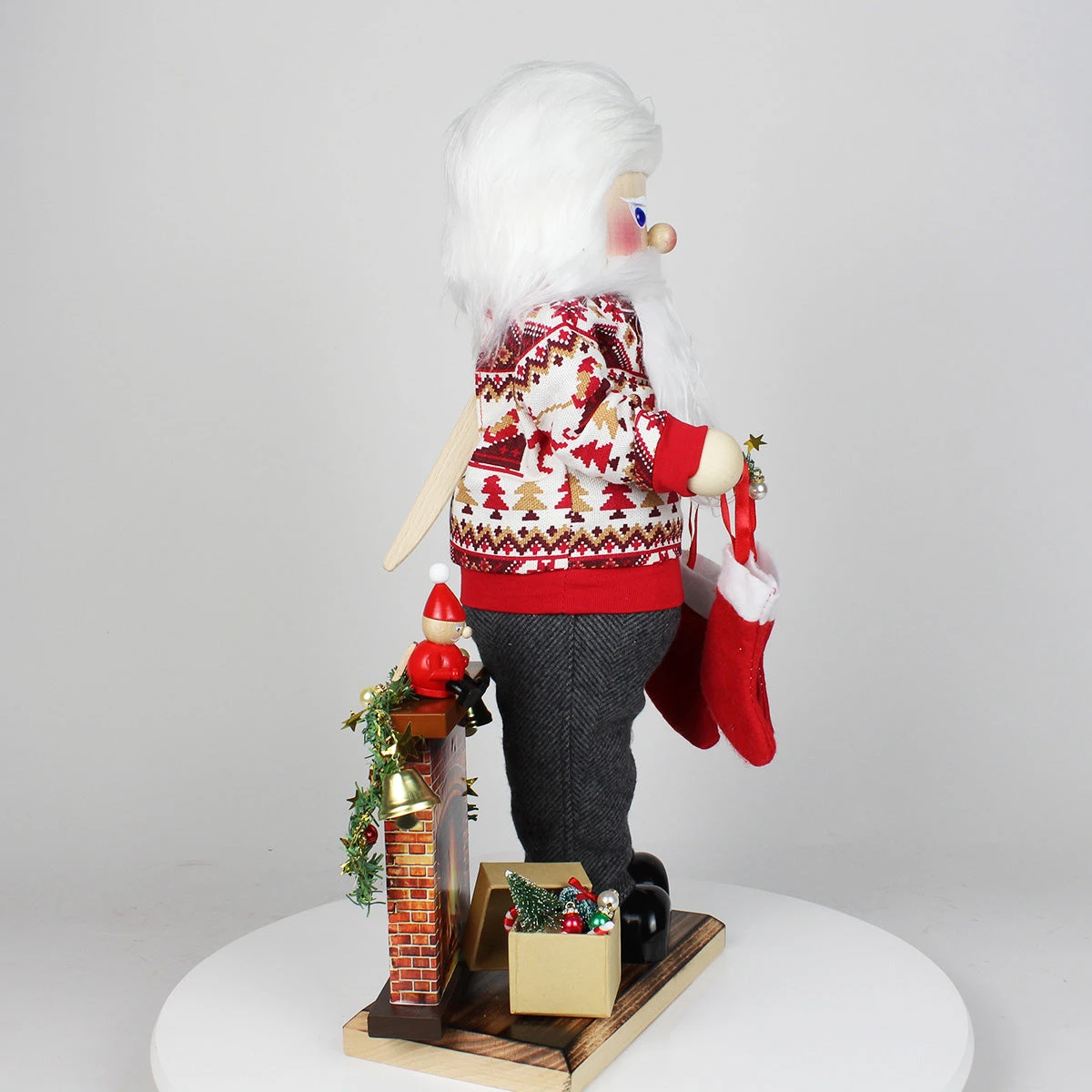 Santa’s garland is adorned with delicate ornaments, and three little stockings hang from his arm, waiting to be filled with sweets and surprises. And, as a final charming touch, a Santa hat peeks from his trouser pocket, as if he just came home after a long day at his workshop and and now wants to enjoy his well-deserved evening off by decorating his living room for Christmas. It’s these little touches that bring this Cozy Decorating Santa to life.