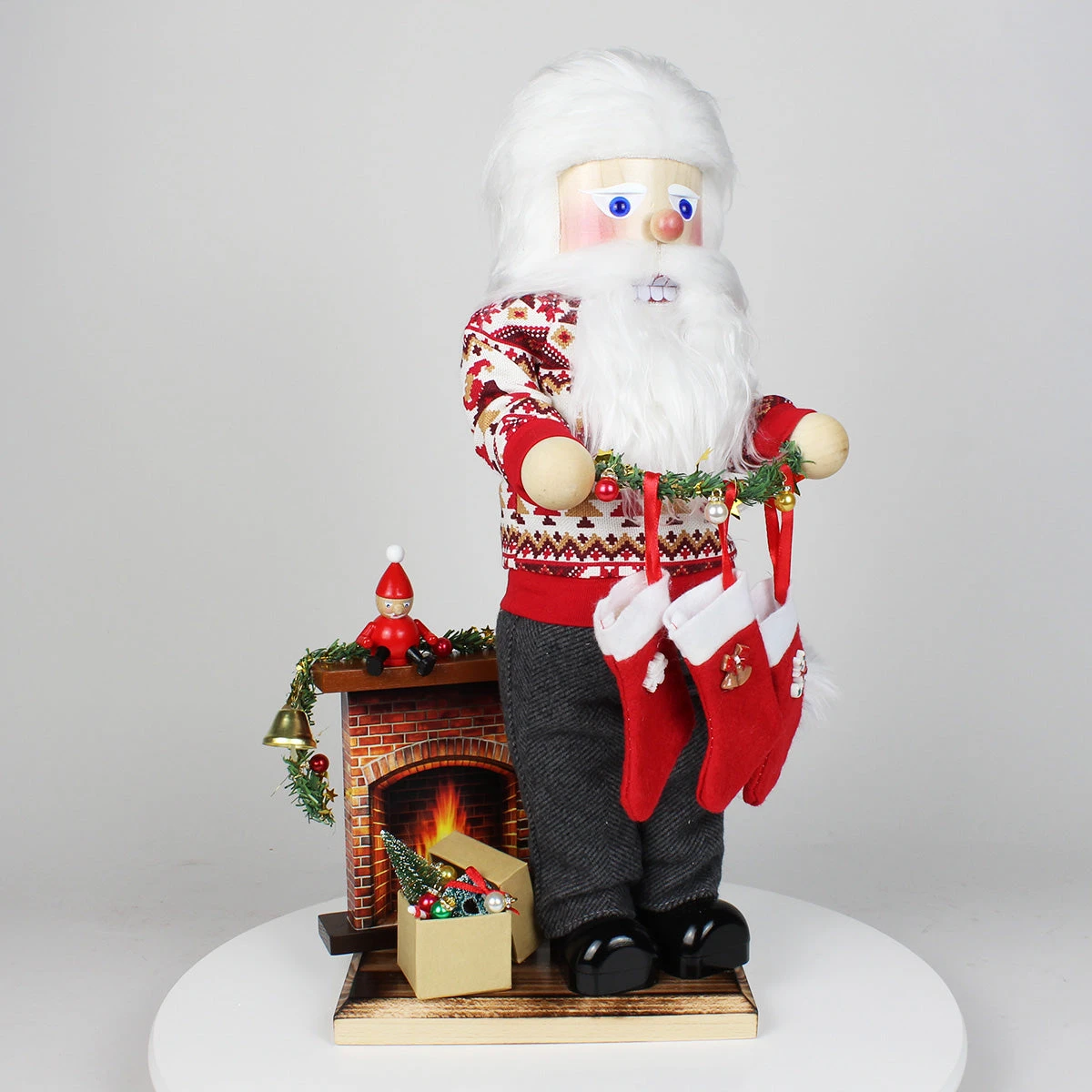 Dressed in a snug, hand-knit-style sweater adorned with traditional holiday patterns, this Santa is ready for a night of decorating by the fireside. Look closely at the fireplace by his side—it’s no ordinary decoration. The bricks and glowing fire transport you to a cozy, festive setting. Atop the mantel, a small handcrafted shelf sitter nutcracker—inspired from our Steinbach Shelf Sitter Collection—sits proudly, watching over the scene with a mischievous sparkle, as if he, too, is part of the holiday magic.