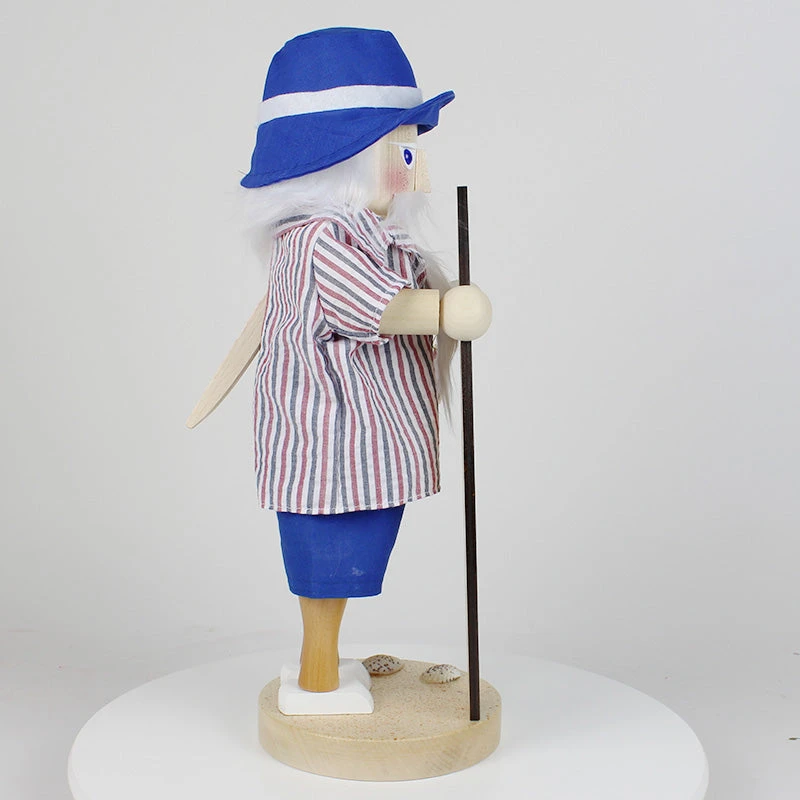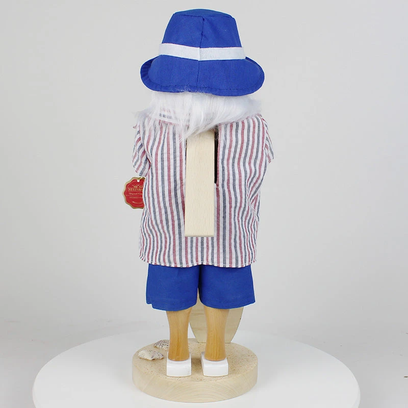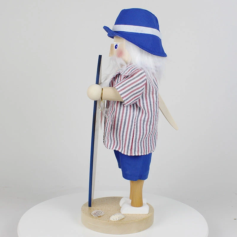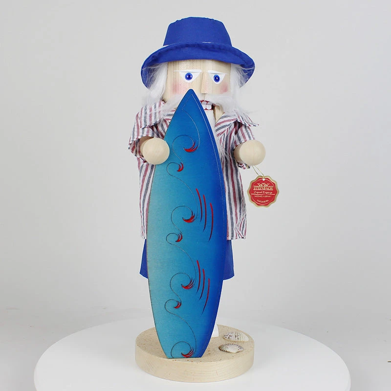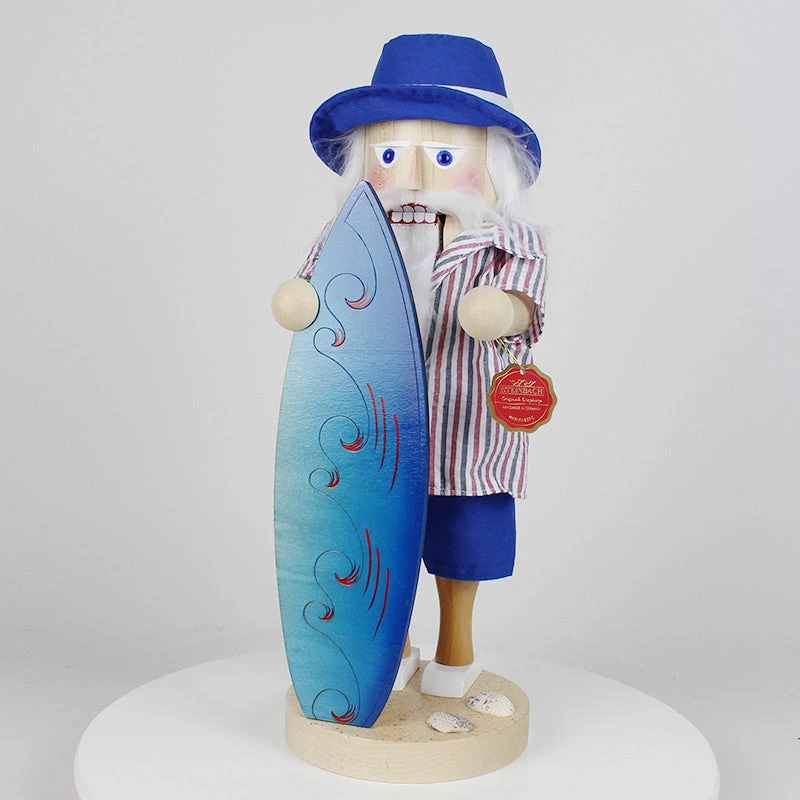 Standing proudly with a beautifully decorated blue surfboard, this Santa is ready to ride the waves. The base of the nutcracker is adorned with seashells, adding an extra touch of seaside charm. You can almost hear the ocean waves and feel the warm sand underfoot as you admire this joyful scene.