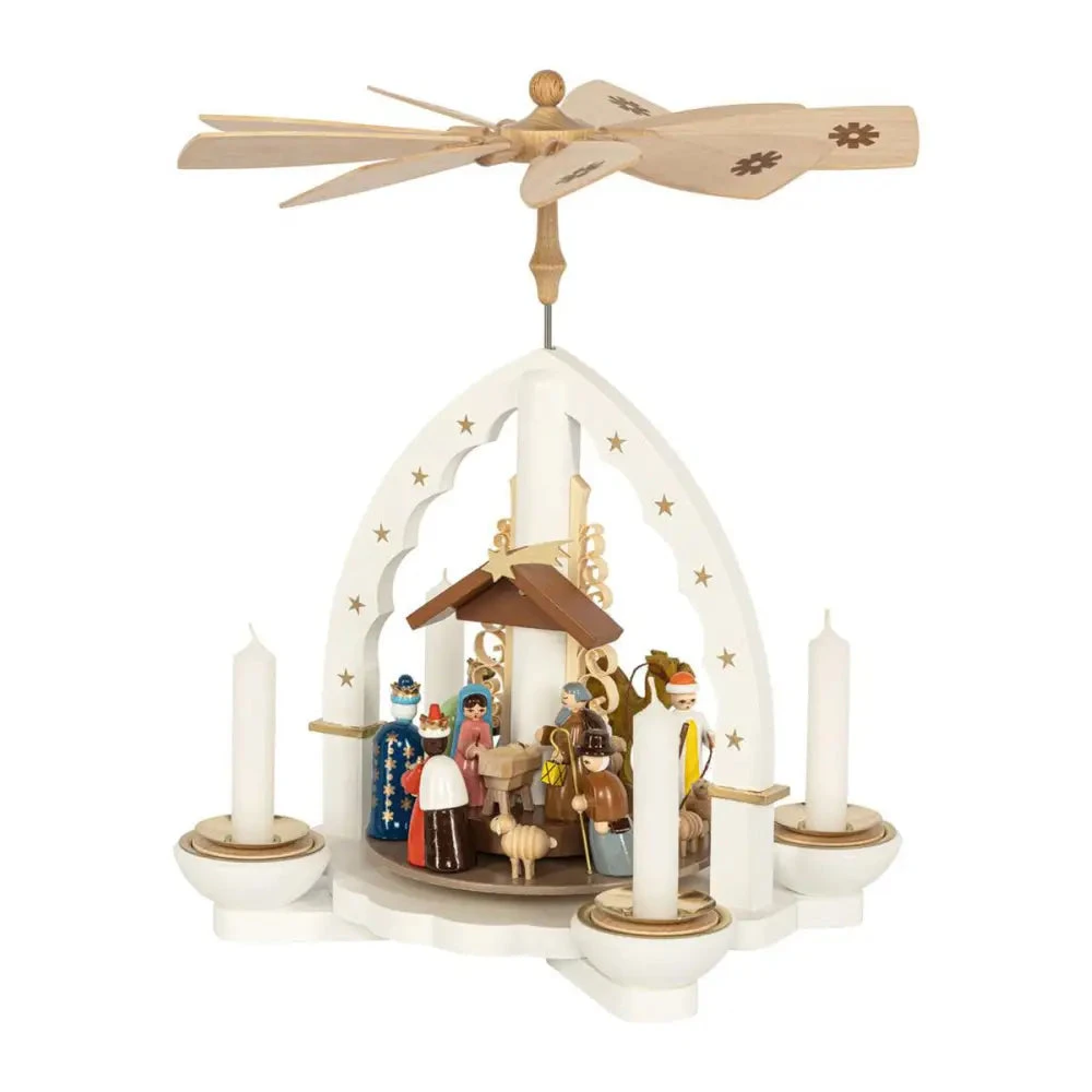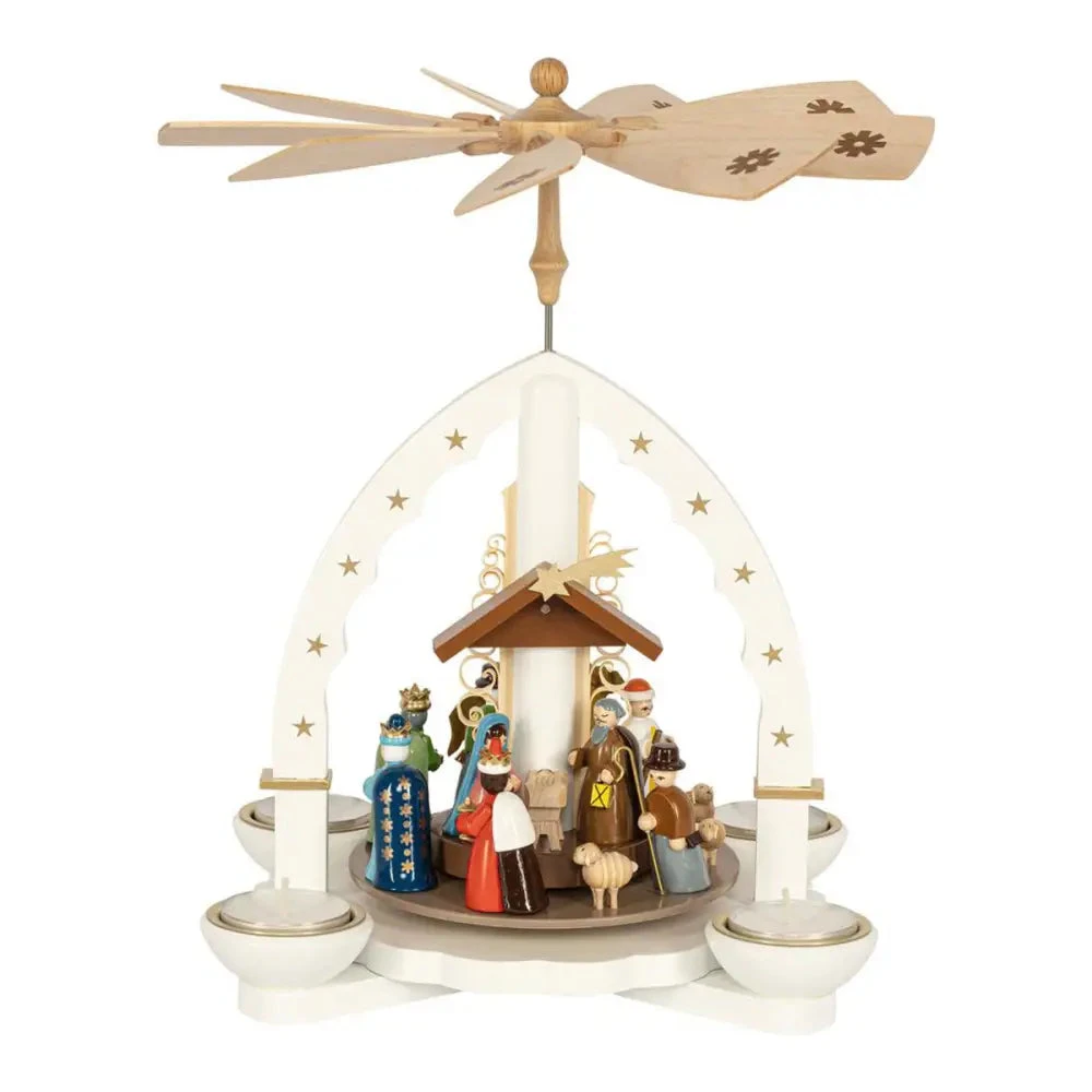Celebrate the season with the gentle glow of the Richard Glässer Christmas Pyramid, a handcrafted treasure from the heart of the Ore Mountains. This elegant pyramid features a beautifully detailed nativity scene, with Mary, Joseph, the Baby Jesus, the Three Wise Men, shepherds, and sheep gathered under a warm stable, all delicately hand-painted in rich, festive colors.