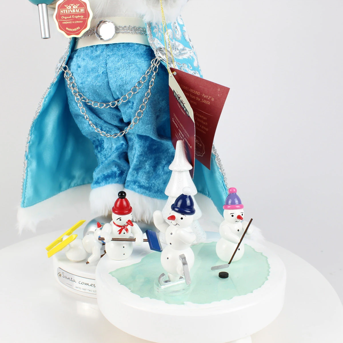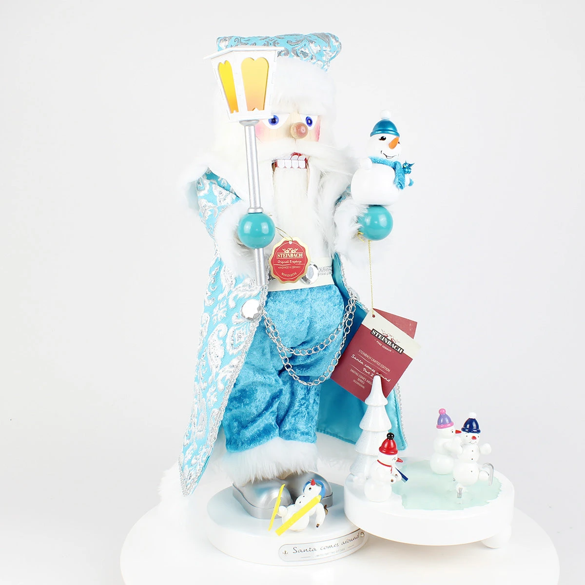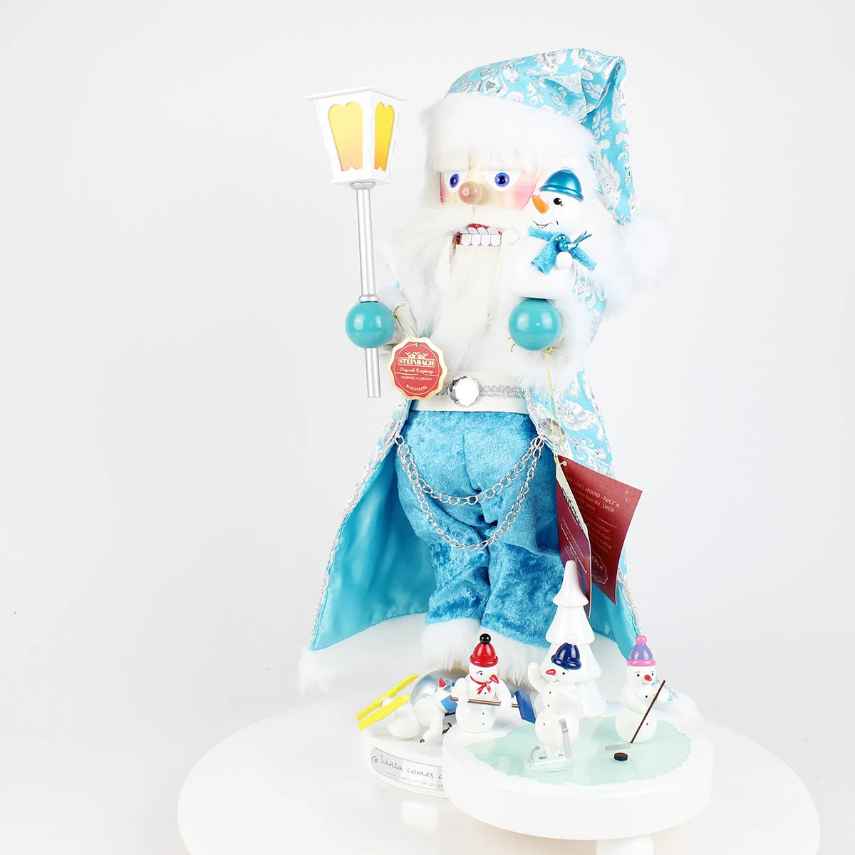 SANTA COMES AROUND – Part 2 is the second creation in this delightful series, showcasing Santa himself, crafted with Steinbach’s legendary attention to detail. Dressed in his festive icy blue coat, Santa holds a joyful little snowman on his arm, a new friend from his winter wanderings. In his other hand he holds a brightly lit lantern to give his new friends warmth and light. But that’s not all—Santa is surrounded by a playful group of snowmen, brimming with life and laughter, brought to life by the skilled artisans of Holzkunst Gahlenz.