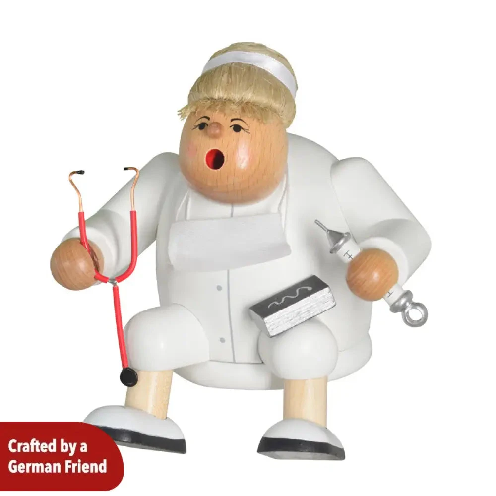 This sitting Smoker Doctor (female) by our friends KWO (Kunstgewerbe-Werkstätten Olbernhau GmbH) is part of their series “Die Dicken” (the chubby ones). She is ready to treat her next patient.