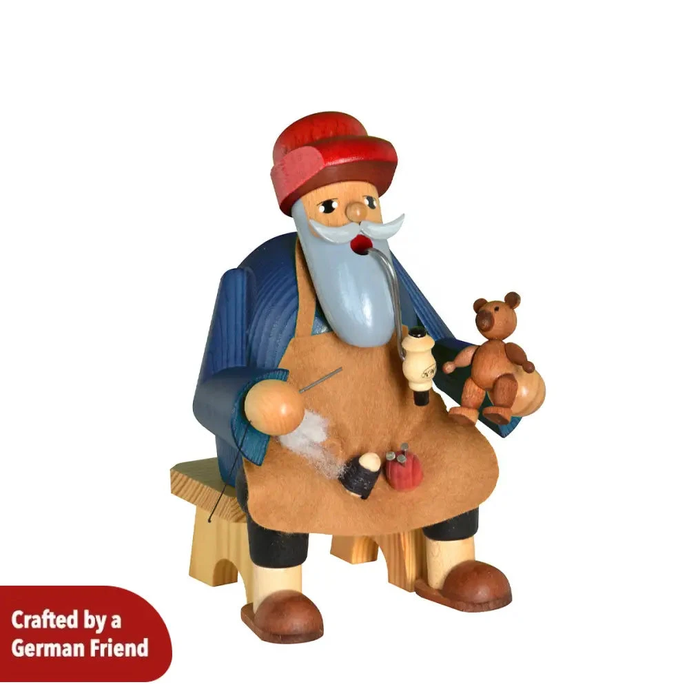 This charming handcrafted figurine, the “Seated Teddy Bear Maker,” captures the warmth and artistry of traditional craftsmanship. The figure is meticulously carved from wood and features a detailed bearded artisan sitting on a wooden bench, skillfully creating adorable teddy bears. Dressed in a felt apron and a red hat, the artisan holds small tools in his hands as he brings the toys to life, reflecting the timeless joy of handcrafted toys.